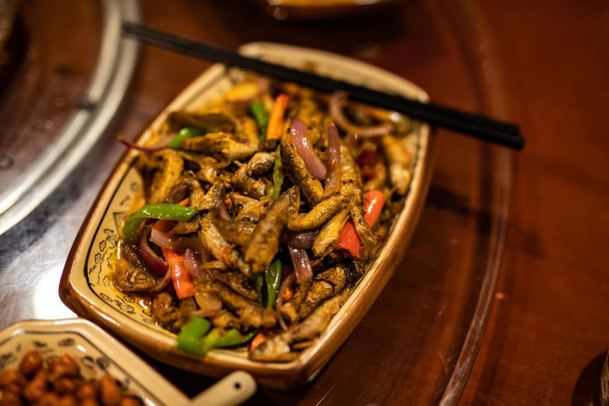 吊锅宴,最中间吊着的一般是鸡汤、鱼汤等,肉多汤足,够6-8人吃饱,另外,还会配3-4种新鲜蔬菜烫着吃。除了吊锅,还可以点几碟当地山珍野味,小河鱼、红烧土猪肉、花生芽都是不错的选择。寒冬的窗外,山风呼啸,漫天繁星,屋里却暖意融融,和朋友边聊边吃,好不热闹。